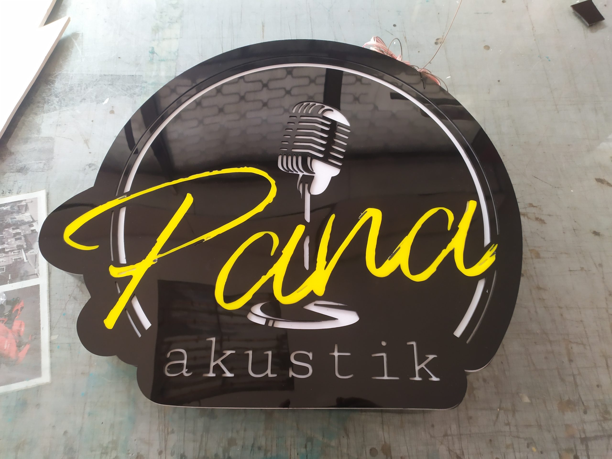 “akustik” ve Mikrofon Logosu: Pleksi yüzeyi lazerle oyularak (dekupe edilerek) arkadan ışık geçirecek hale getirilmiş.
